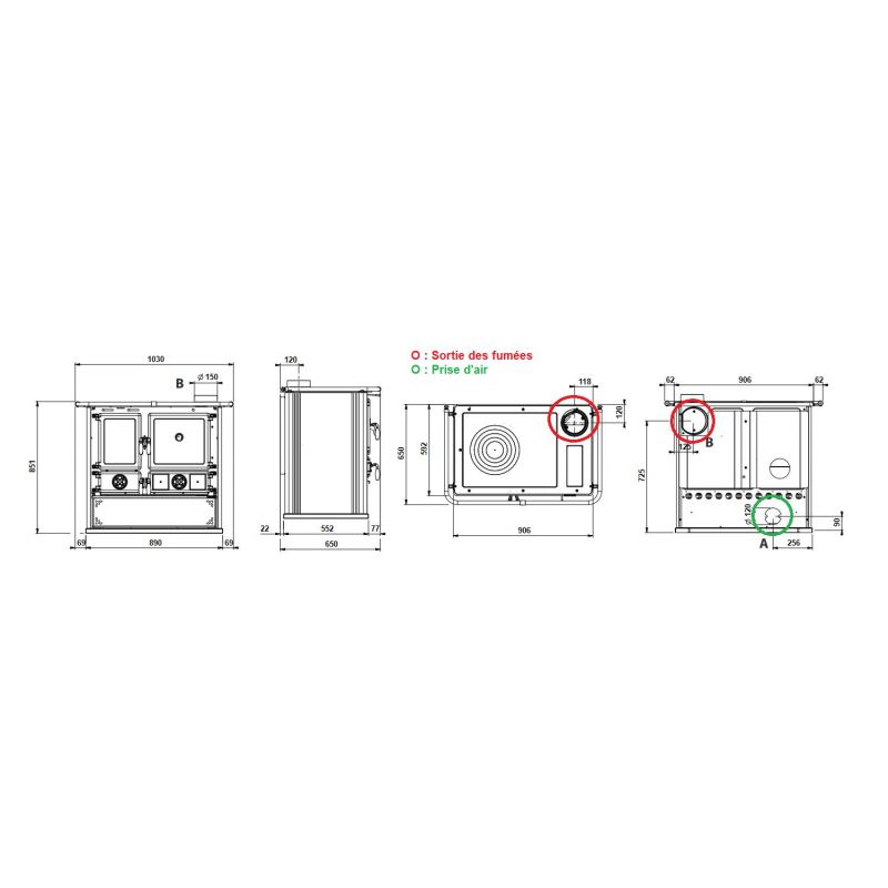 - Diamètre des sorties des fumées : 150 mm