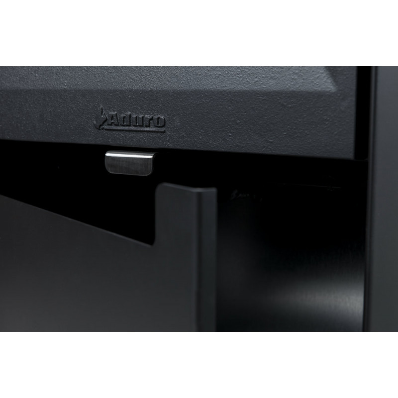 Le poêle à bois Aduro 14 se distingue avec un design cubique, épuré et élégant. Il allie esthétique et performances avec ses 9 kW de puissance permettant de chauffer jusqu’à 140m², son dispositif de régulation automatique de l’air (Aduro-tronic) et son système efficace de nettoyage de la vitre. Sa grande réserve de bois fermée par un battant est utile pour stocker le bois et les accessoires. La porte en fonte du poêle représente aussi un atout pour assurer une meilleure diffusion de la chaleur dans la pièce. La fonte emmagasine la chaleur et la restitue longuement, même après extinction du feu.